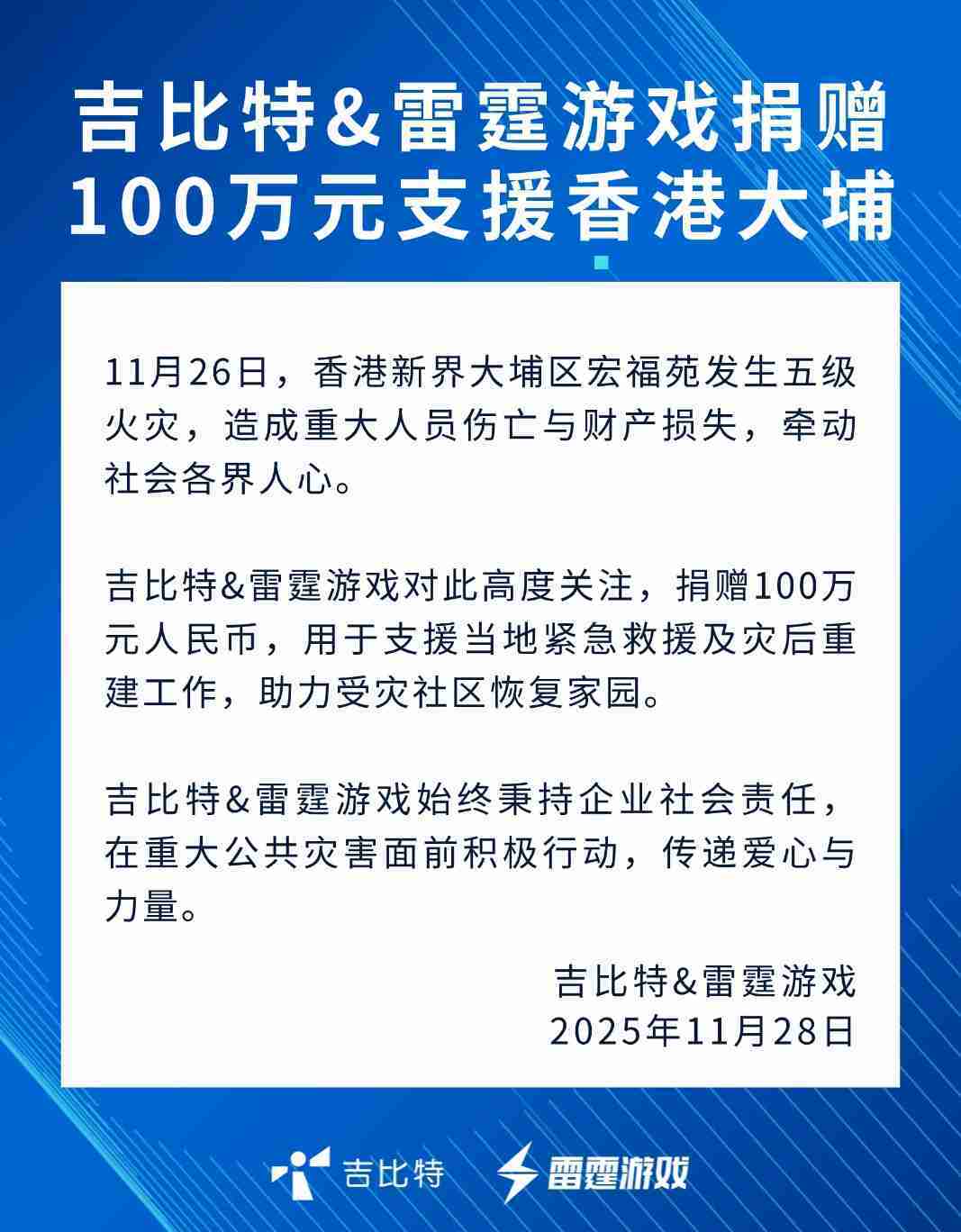 J9.COM&雷霆游戏捐赠100万元 支援香港大埔火灾救援及灾后重建